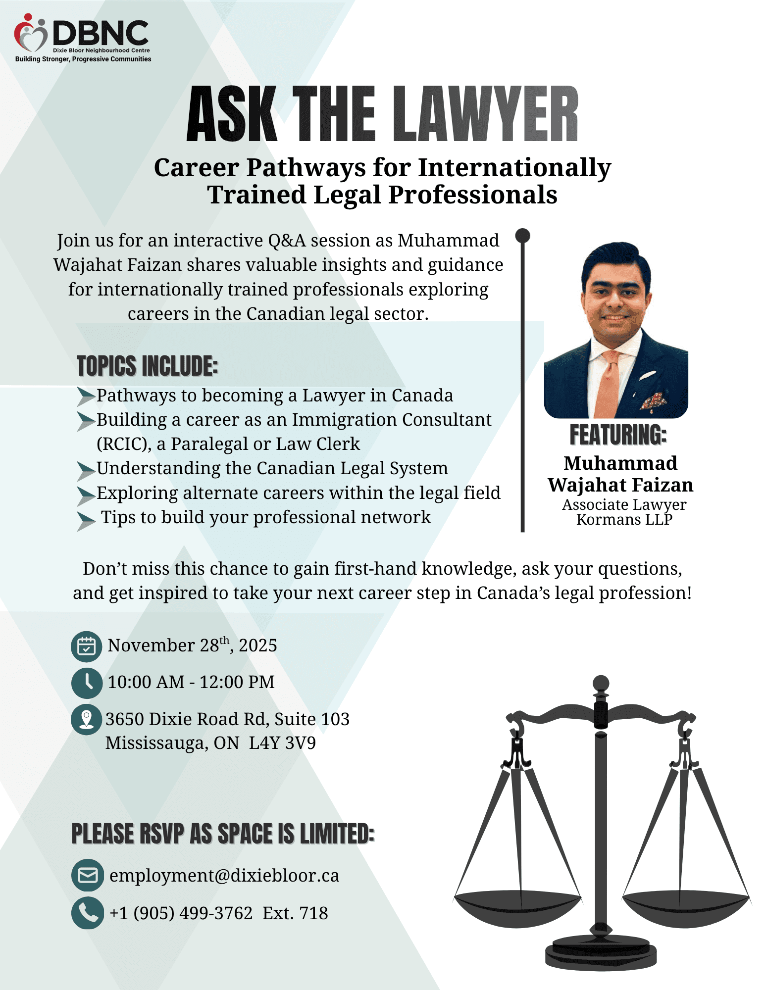 Join Muhammad Wajahat Faizan, Associate Lawyer with Kormans LLP in an interactive Q & A session as he shares Career Pathways for Internationally Trained Professional in the Legal related occupation such as: