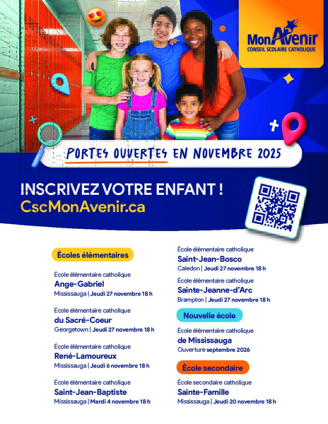 The Conseil scolaire catholique MonAvenir is hosting open houses at its elementary schools throughout November 2025. Families can visit the schools to learn more about French-language Catholic education, programs, and registration options. For more information, please visit cscmonavenir.ca/Openhouses.