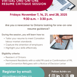 Are you a newcomer to Ontario looking for one-on-one resume guidance? During the session, you will learn how to: Tailor your resume to meet Canadian labour market standards Capture the attention of employers Highlight your skills effectively Eligibility Criteria Resident of Ontario Permanent Residents with a valid PR card or Confirmation of PR, and Convention […]