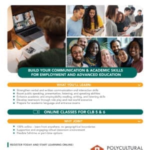 LINC CLB 5–6 describes an intermediate to advanced-high English proficiency level in Canada, focusing on practical communication for social, workplace, and academic settings. These classes are offered online only. To register, please contact: Rocheal: rphillips@polycultural.org or Grazyna: gdrazdzewska@polycultural.org